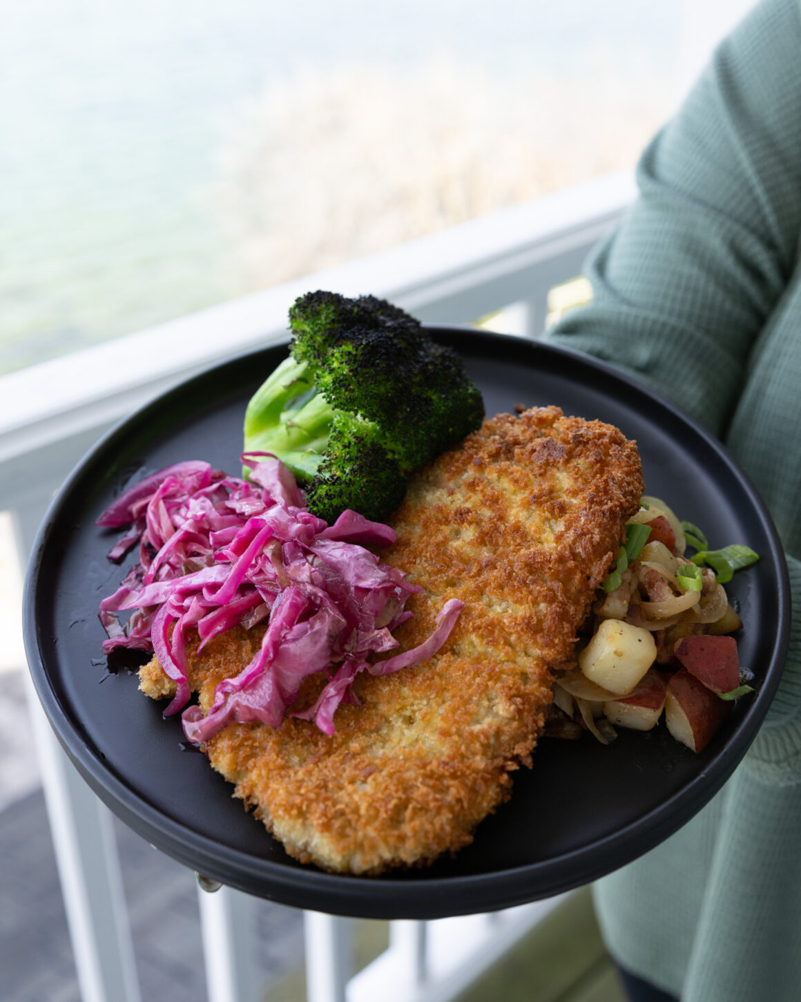 Wienerschnitzel – crispy veal cutlet, drizzled with a lemon gastrique, served with purple kraut and potatoes